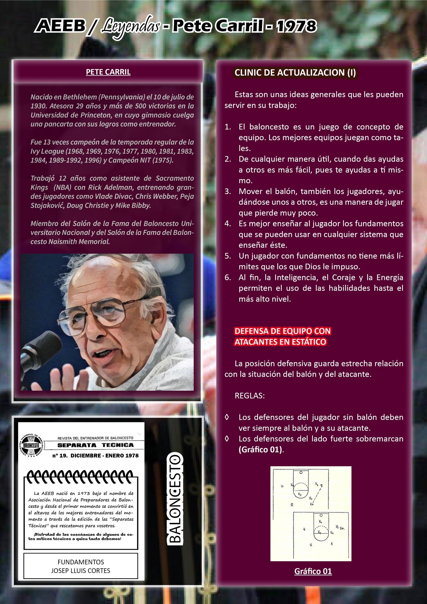 Alcanzamos así la sección AEEB “Leyendas”, donde homenajeamos a los grandes técnicos de este deporte. En este número os presentamos “Clinic de Actualización (I)”, trabajo firmado por uno de los más respetados entrenadores norteamericanos, Pete Carril, con más de 500 victorias en la Universidad de Princeton y experiencia NBA (12 temporadas) como asistente de Sacramento Kings (NBA) con Rick Adelman, entrenando grandes jugadores como Vlade Divac, Chris Webber, Peja Stojaković, Doug Christie y Mike Bibby.