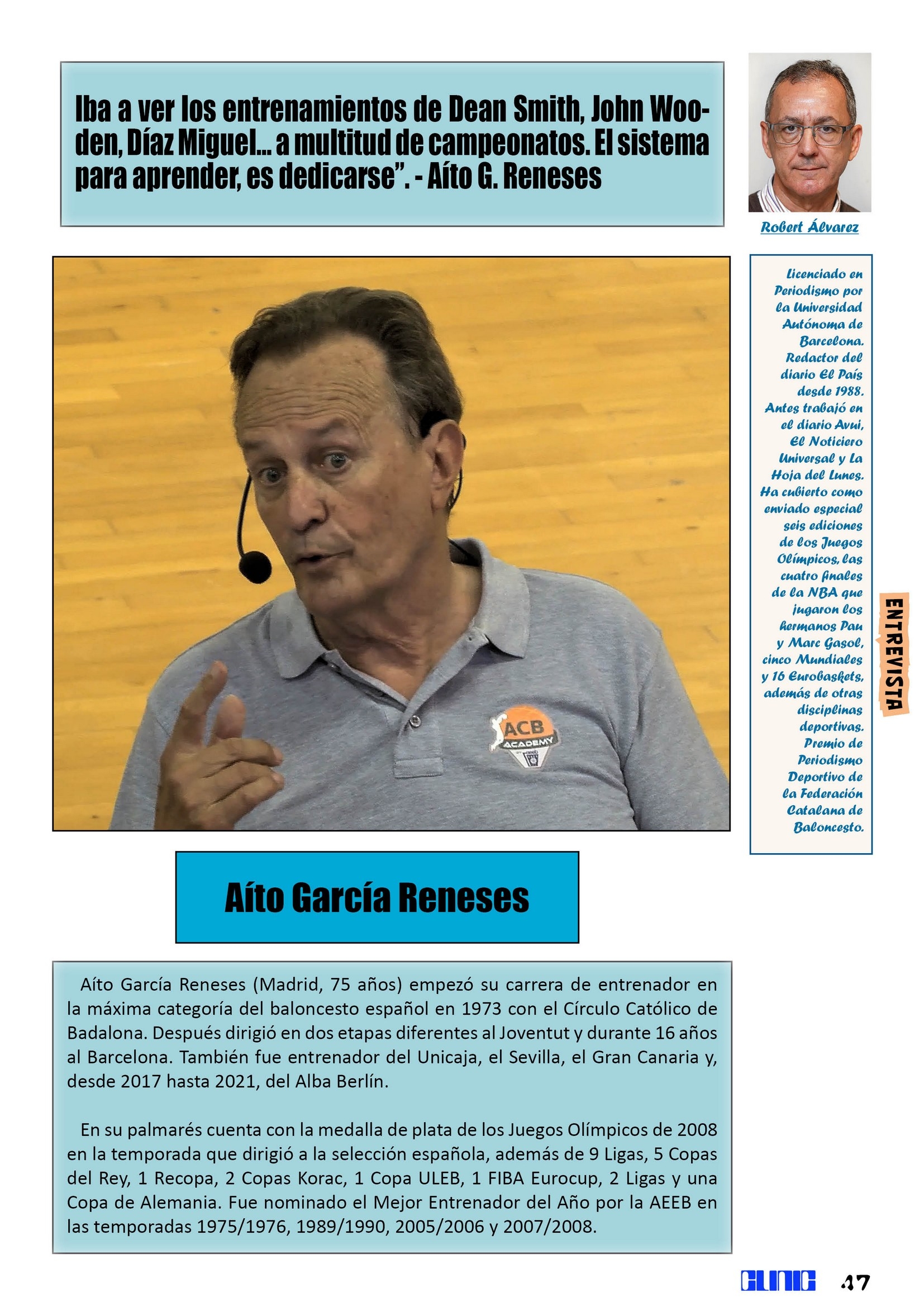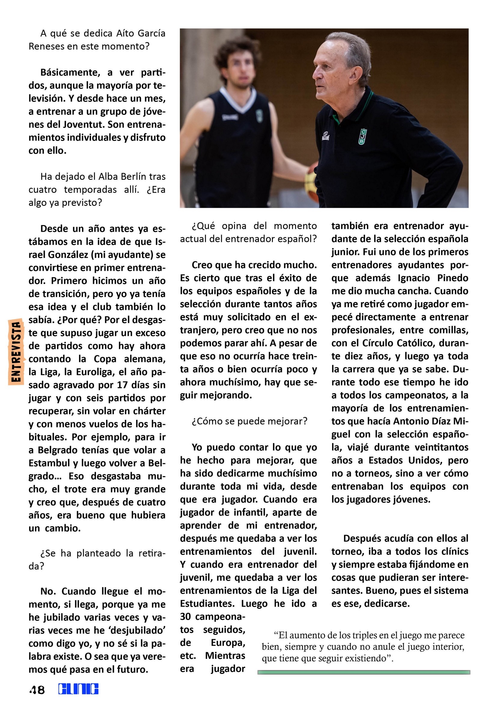 Finalizamos -como es habitual- con la entrevista. En este caso, tenemos la oportunidad de contar con Aíto García Reneses, un clásico de nuestro baloncesto que acaba de volver a la estructura del Joventut de Badalona para trabajar con los jóvenes talentos del club, tras su experiencia en Alemania con el Alba de Berlín. Respecto a cómo no dejar nunca progresar, nos dice: “Yo iba a ver los entrenamientos de Dean Smith, John Wooden, Díaz Miguel… a multitud de campeonatos. El sistema para aprender, es dedicarse”. – Aíto G. Reneses.