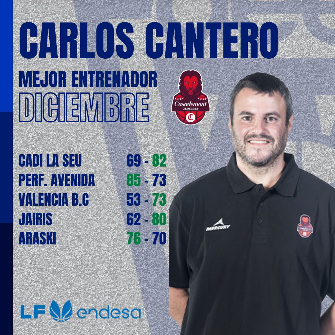 Tras la conclusión de la decimotercera jornada de la Liga Femenina Endesa, Carlos Cantero, entrenador del Casademont Zaragoza, ha sido reconocido como Mejor Entrenador del Mes de Diciembre – Trofeo AEEB, un galardón que premia el excelente rendimiento de su equipo durante un mes inmaculado.