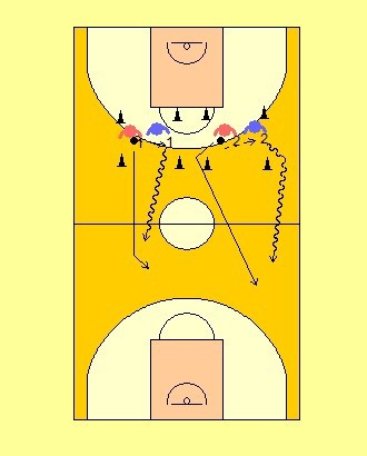 Explicación: Desde espacio reducido defensora y atacante se van pasando balón con pases cortos y rápidos. Cuando jugadora atacante quiera, saldrá hacia canasta, tiene dos opciones, lateral o de frente, defensora tendrá que recuperar y ponerse totalmente delante de la atacante.