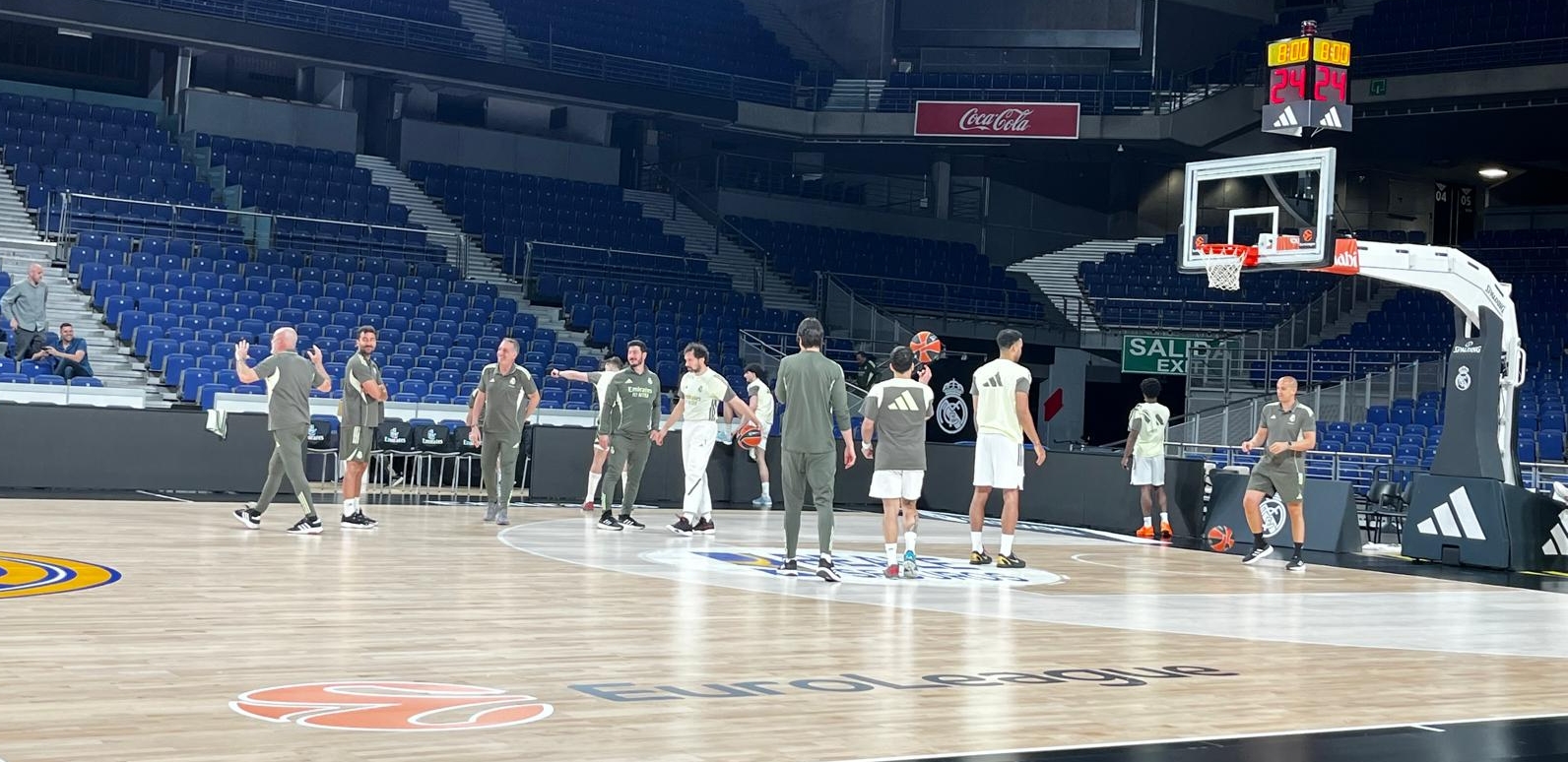 Tras dos jornadas de profunda inmersión táctica, hoy hemos vivido la realidad del parqué en el Movistar Arena. Aunque el inicio se retrasó ligeramente por cuestiones organizativas, la experiencia de pisar la pista mientras el equipo ultimaba los detalles para el choque de Euroliga ha sido de un valor incalculable. Estar allí, a escasos metros de la acción, te permite percibir una perspectiva del juego que la grada no ofrece: la velocidad, el sonido del balón y, sobre todo, el clima de concentración extrema que envuelve a una plantilla de este nivel. Hemos sido testigos mudos de una preparación minuciosa, donde el staff repasaba cada concepto trabajado durante la semana con un rigor absoluto, como entrenadores que amamos este deporte, hemos disfrutado de ser observadores privilegiados, acompañando desde un segundo plano y con el mayor de los respetos esa atmósfera de trabajo tan intensa que requiere la alta competición.
