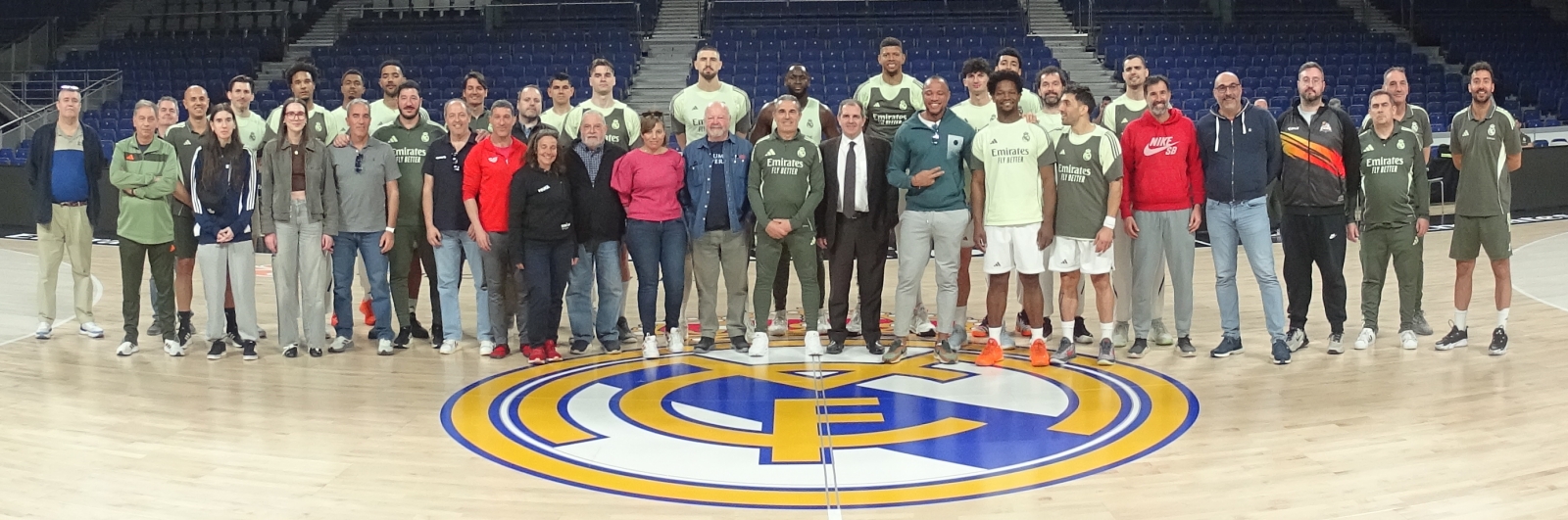 Esa profesionalidad y el clima de exigencia que se respira no han sido obstáculo para que volviéramos a sentir la calidad humana que rodea a este grupo. No ha hecho falta romper su burbuja de trabajo para sentir su generosidad; el equipo nos ha permitido asomarnos a su día a día con total naturalidad y, al finalizar la sesión, nos han dedicado unos minutos de su tiempo que valoramos de corazón. El poder intercambiar unas palabras con el cuerpo técnico y algunos jugadores que se detuvieron con nosotros, así como el detalle de la foto de familia en el parqué, son gestos que demuestran que la excelencia no está reñida con la cercanía. Sentir de cerca ese ánimo y la seriedad con la que afrontan el reto de hoy, ha sido una experiencia fantástica para todos los que formamos esta expedición.
