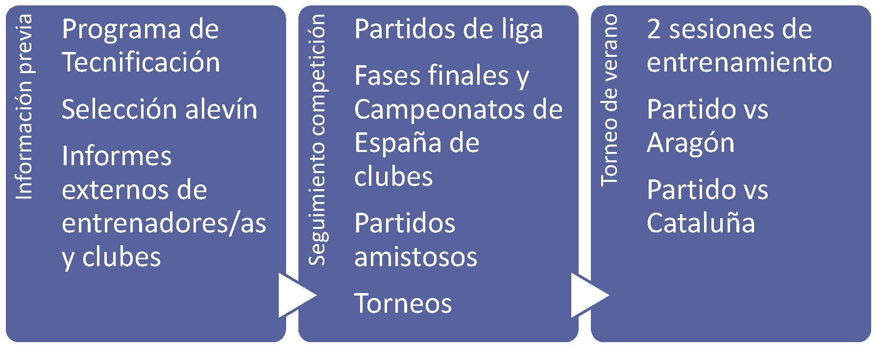 Todo comienza normalmente en el mes de febrero con la sesión de detección de la generación, donde las vemos entrenar en un contexto competitivo. Previamente disponemos información de años anteriores, de seguimientos en edad alevín o incluso del Programa de Tecnificación que realizamos en edades más tempranas. A este entrenamiento le sucede un seguimiento en los partidos de liga, posibles amistosos y torneos en lo que resta de temporada. Esto nos permite hacernos una idea de cómo es la generación que competirá meses después en el Campeonato de España.