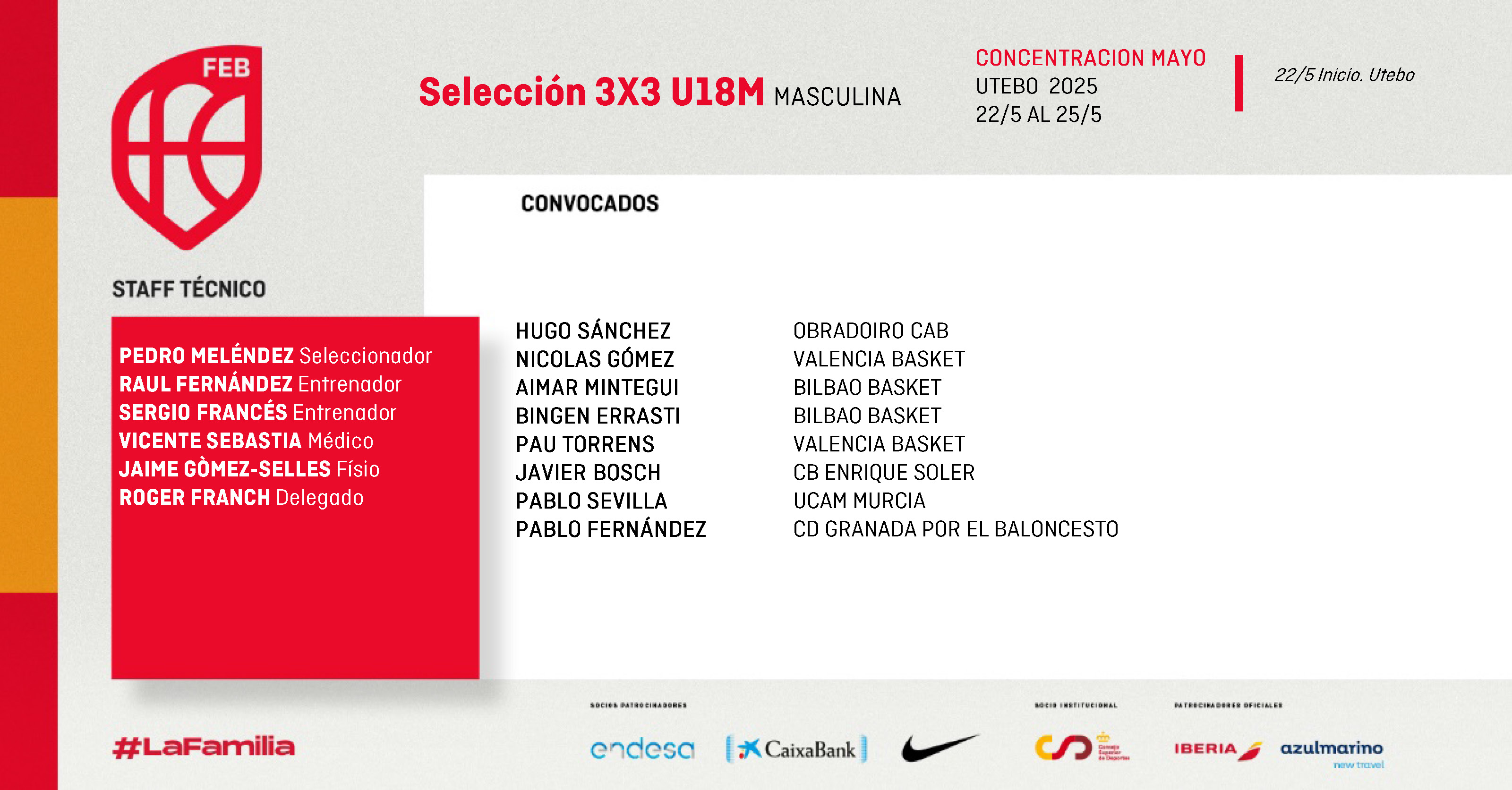 Pedro Meléndez contará con el apoyo de Raúl Fernández y Sergio Fernández para dirigir a un grupo de ocho jóvenes talentos que buscarán consolidarse como referentes del 3x3 nacional. Los convocados para esta concentración son: Hugo Sánchez, Nicolás Gómez, Aimar Mintegui, Bingen Errasti, Pau Torrens, Javier Bosch, Pablo Sevilla y Pablo Fernández.