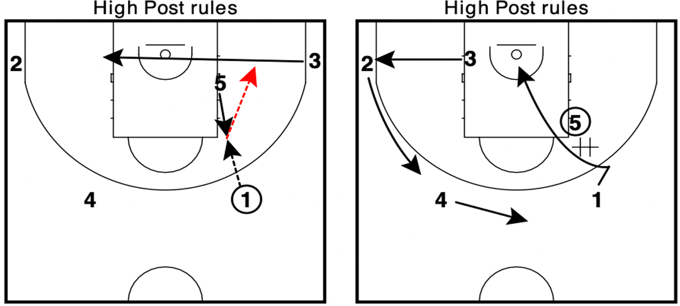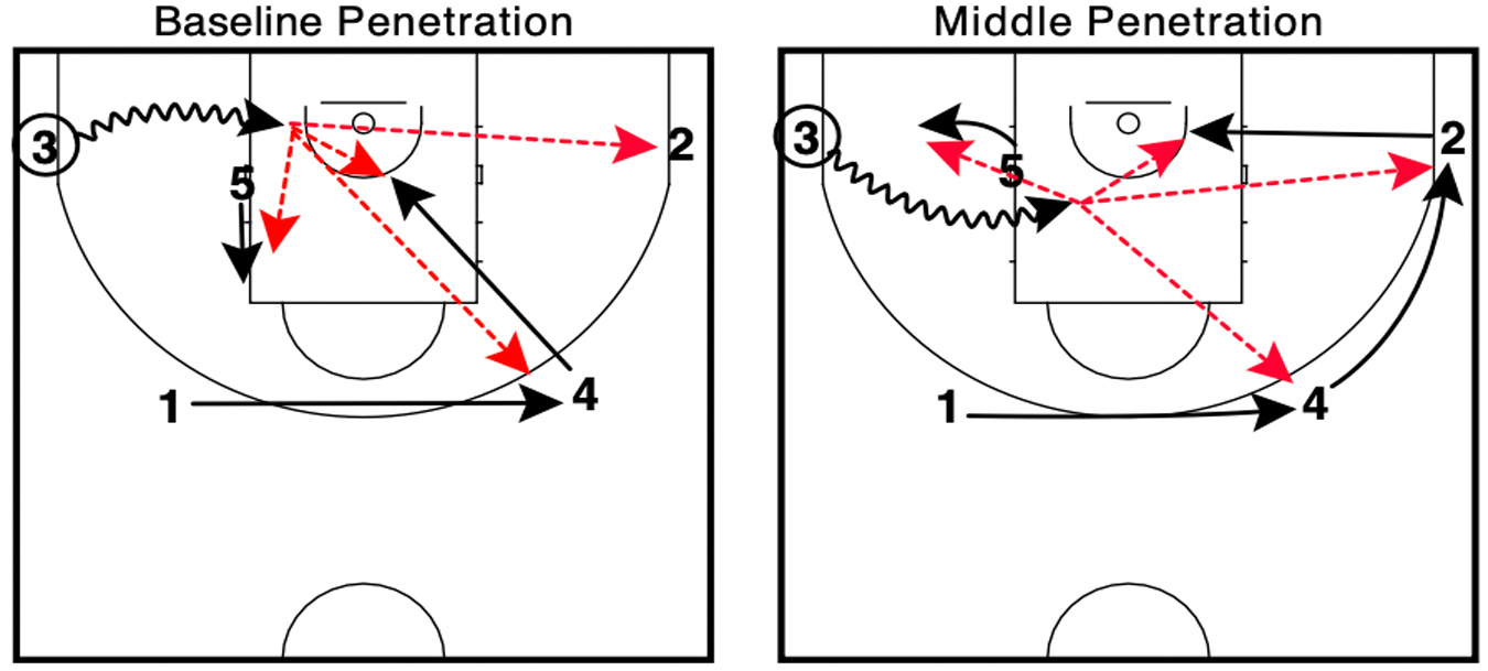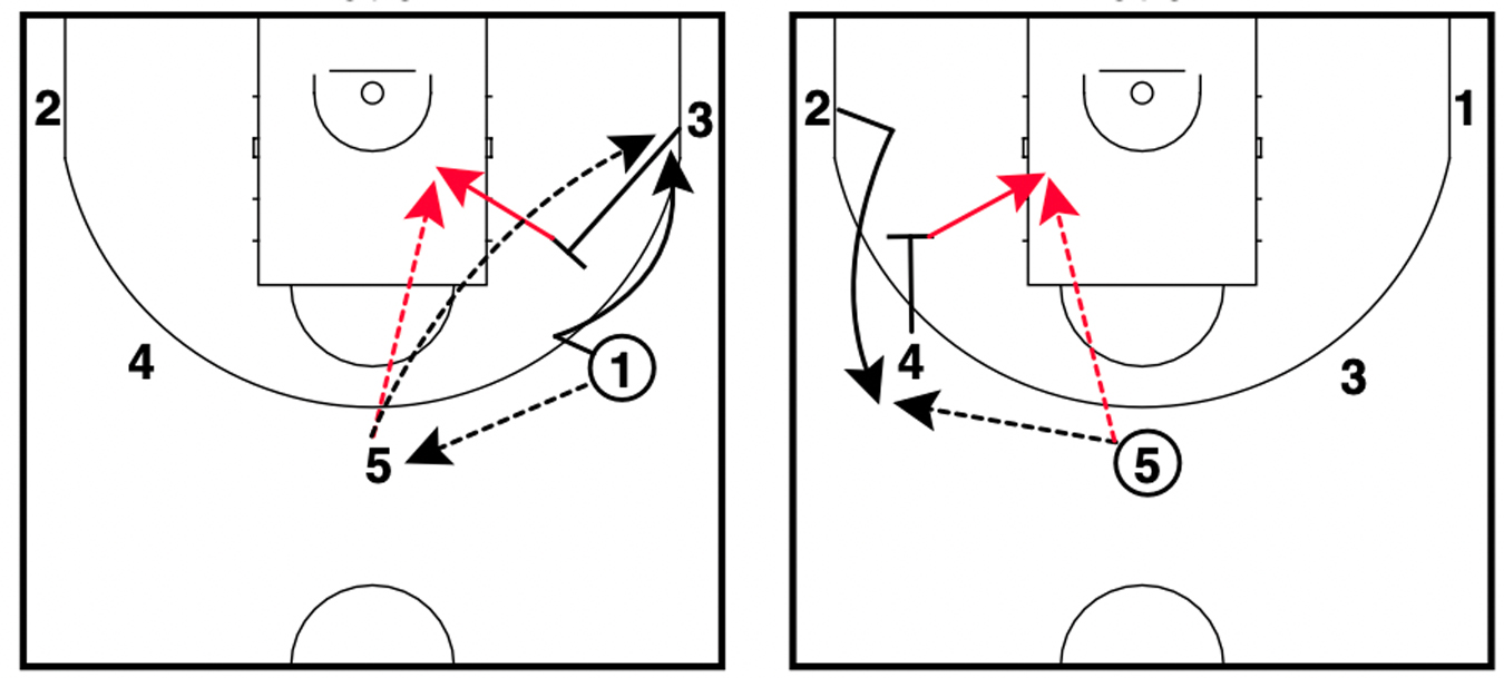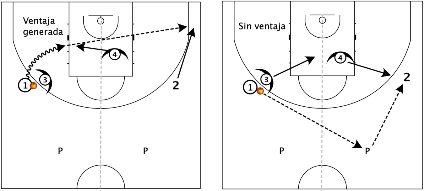Si, por el contrario, corre por detrás del balón (a esto le llamamos dragon), tendremos opciones de jugar bloqueo directo en llegada o usar al pívot como generador de juego desde cabecera con un spacing de 5 abiertos, generando ventajas desde el bloqueo indirecto.