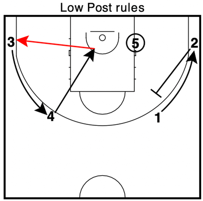 Si nuestro hombre grande corre por delante de balón (a esto le llamamos rabbit), fija posición en la zona para sellar a su defensor, con el mismo objetivo principal: favorecer la finalización del manejador a campo abierto (spacing 4out 1in).