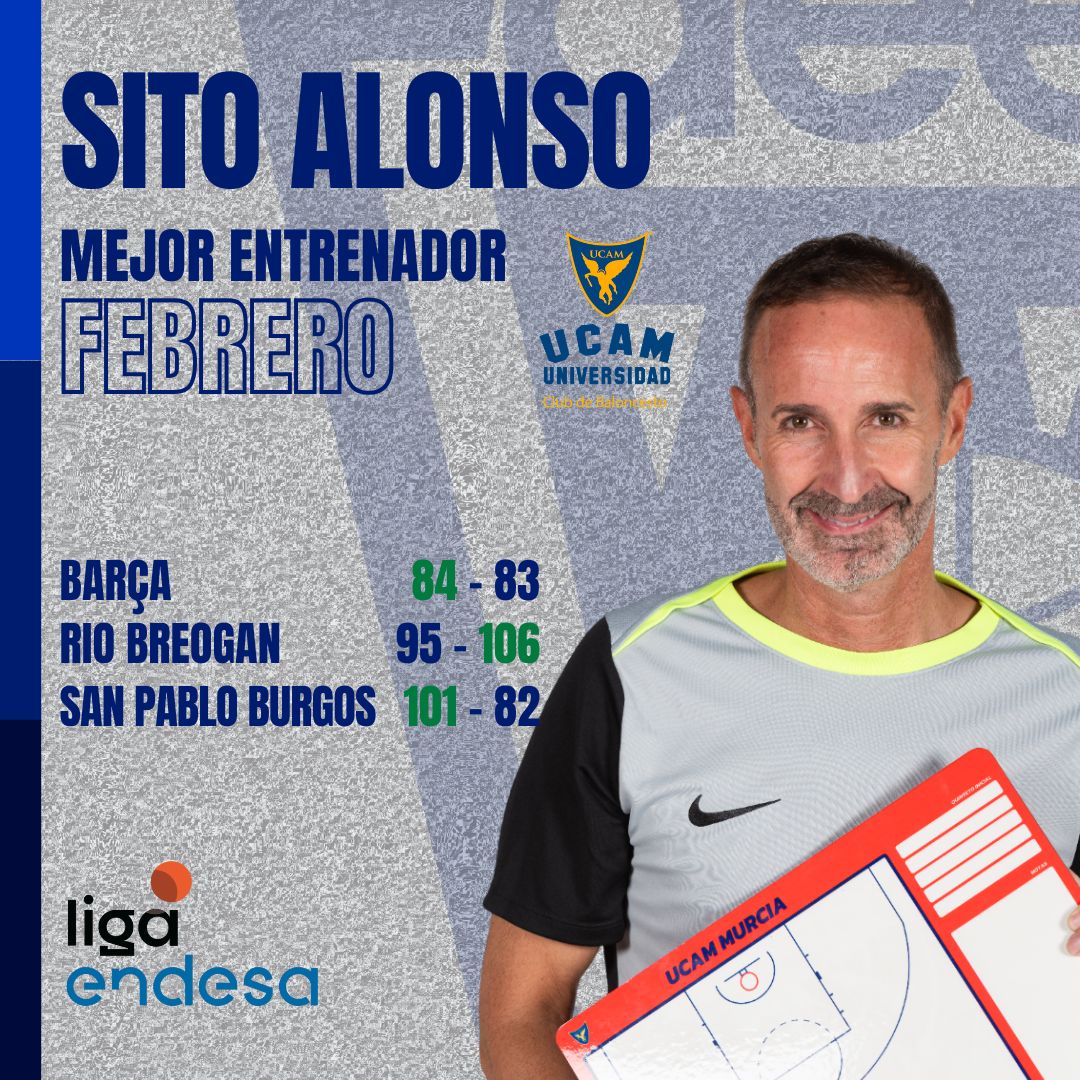 El entrenador UCAM Murcia, Sito Alonso, ha sido galardonado Mejor Entrenador del Mes de Febrero – Trofeo AEEB tras completarse la vigésima jornada de la Liga Endesa. Este reconocimiento premia el sobresaliente desempeño del equipo murciano durante un mes marcado por su constancia y competitividad.