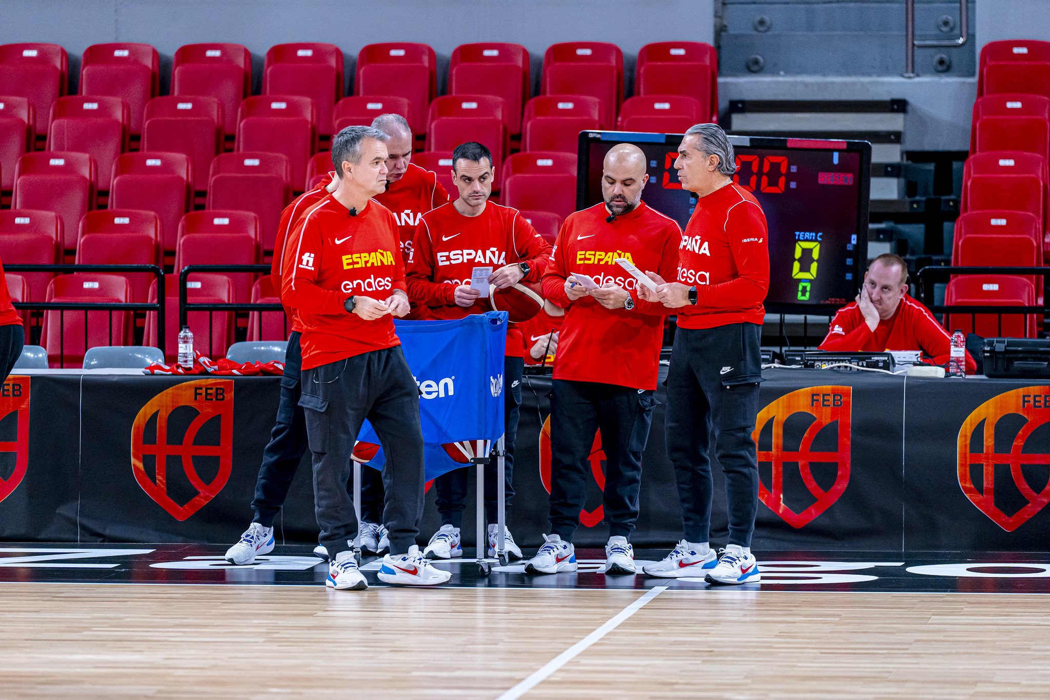 Sistemas en 5x0, trabajo en 4x4 a media pista con foco en el rebote defensivo por ser “uno de los que más problemas tuvimos en el Mundial” en palabras de Scariolo, trabajo del close out en 3x3, defensa del bloqueo directo y del repick en 2x2 y en 4x4 a toda cancha o trabajo de la defensa de transición se fueron concatenando en una sesión planificada al segundo y que terminó en 5x5 a media pista arbitrada por árbitros de la Federación Aragonesa antes de finalizarla ejercicios competitivos de tiro.